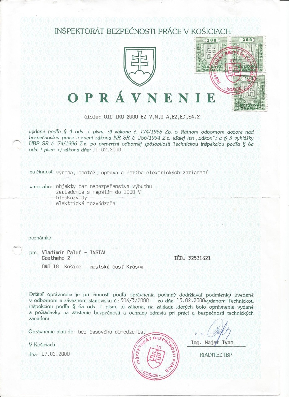 Elektroinštalácie do 1000V a odborné prehliadky .